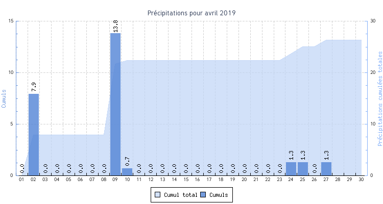 | 04 | 0.4 °C à 07:53 | 13.9 °C à 14:19 | 7.0 °C | 1.2 km/h (11.3 km/h) | 167 |