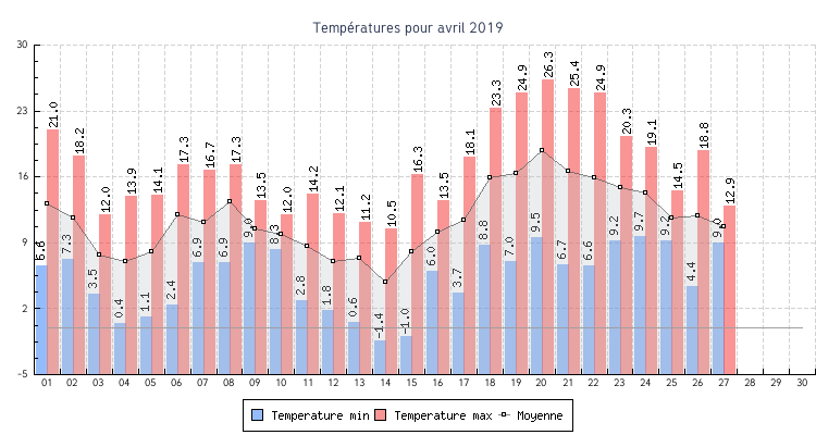 | 14 | -1.4 °C à 07:10 | 10.5 °C à 14:48 | 4.8 °C | 0.9 km/h (10.0 km/h) | 39 |