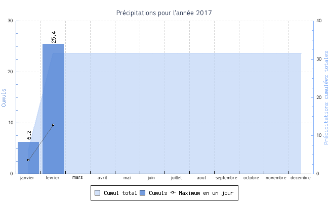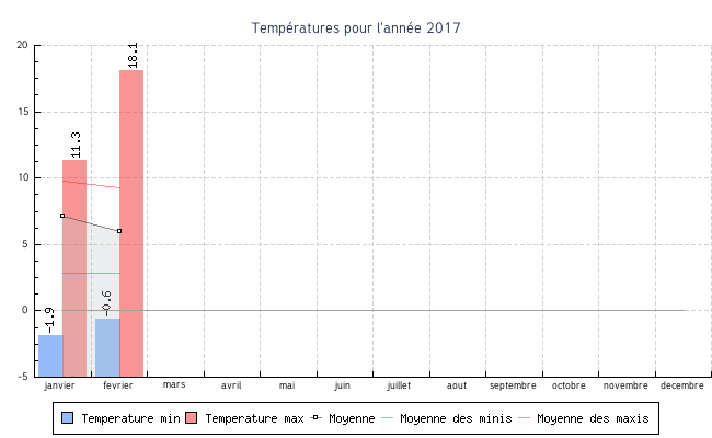 | fevrier | -0.6 °C | 2.8 °C | 18.1 °C | 9.3 °C | 6.0 °C | 2.5 km/h | 34.1 km/h | E |
